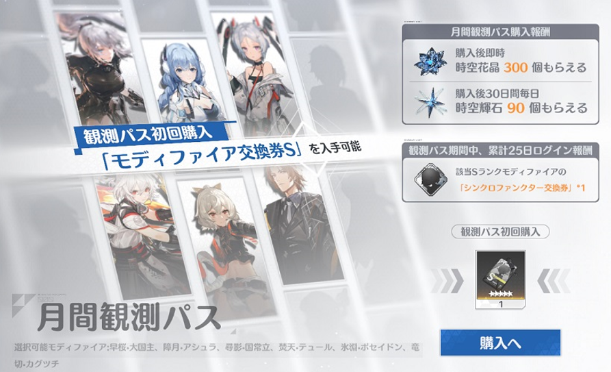 毎日ログインするようなプレイヤーであれば、「月間観測パス(600円)」がコスパがよくおすすめです。購入時に石300個、その後30日間はログインボーナスとして90個/日の石がもらえます(最大3000個)。