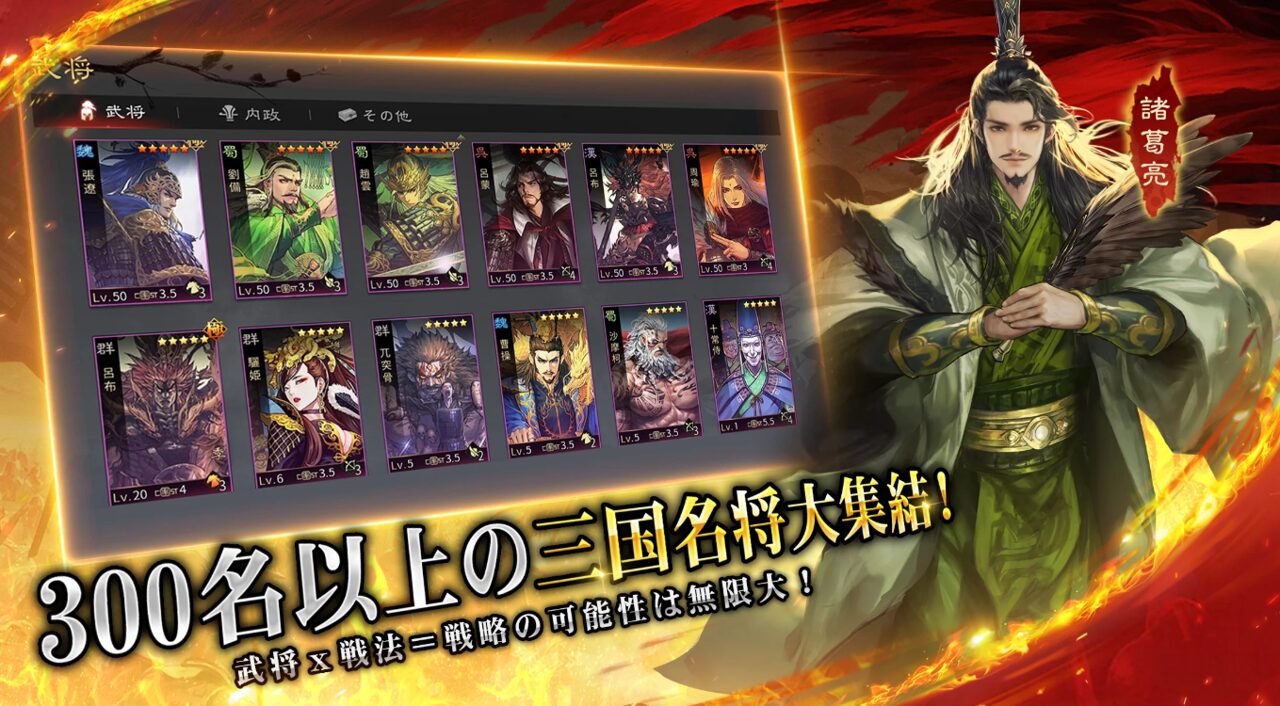 本作は三国志の歴史や武将をベースにしており、実在の人物が多数登場します。それぞれの武将には固有スキルや能力が設定されており、史実を意識した構成が魅力です。プレイヤーはお気に入りの武将を育成し、自分だけの最強部隊を編成できます。