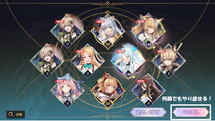 チュートリアルガチャはSSRキャラクター1~2体が確定でゲットできます。SSRを2体ゲットできた段階で進めるのがおすすめです。
