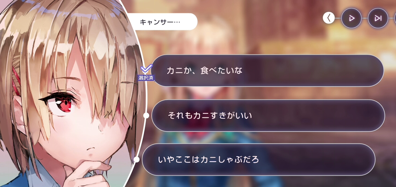 最初はキャラ同士の掛け合いを冷めた目で見ていましたが、途中から掛け合いを欲している自分がいました。気付けば自ら変な選択肢を選ぶくらいになっていました。ストーリーが少し進むとシリアスな展開もあったり、引き込まれる部分もありました。