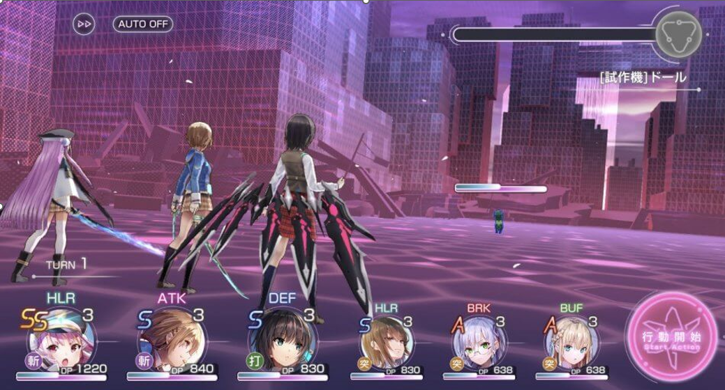 キャラごとに役割(7種類)や属性(斬、打、突)が割り当てられており、キャラの役割を考慮して攻撃のタイミングを工夫することで戦闘を有利に進めることができます。