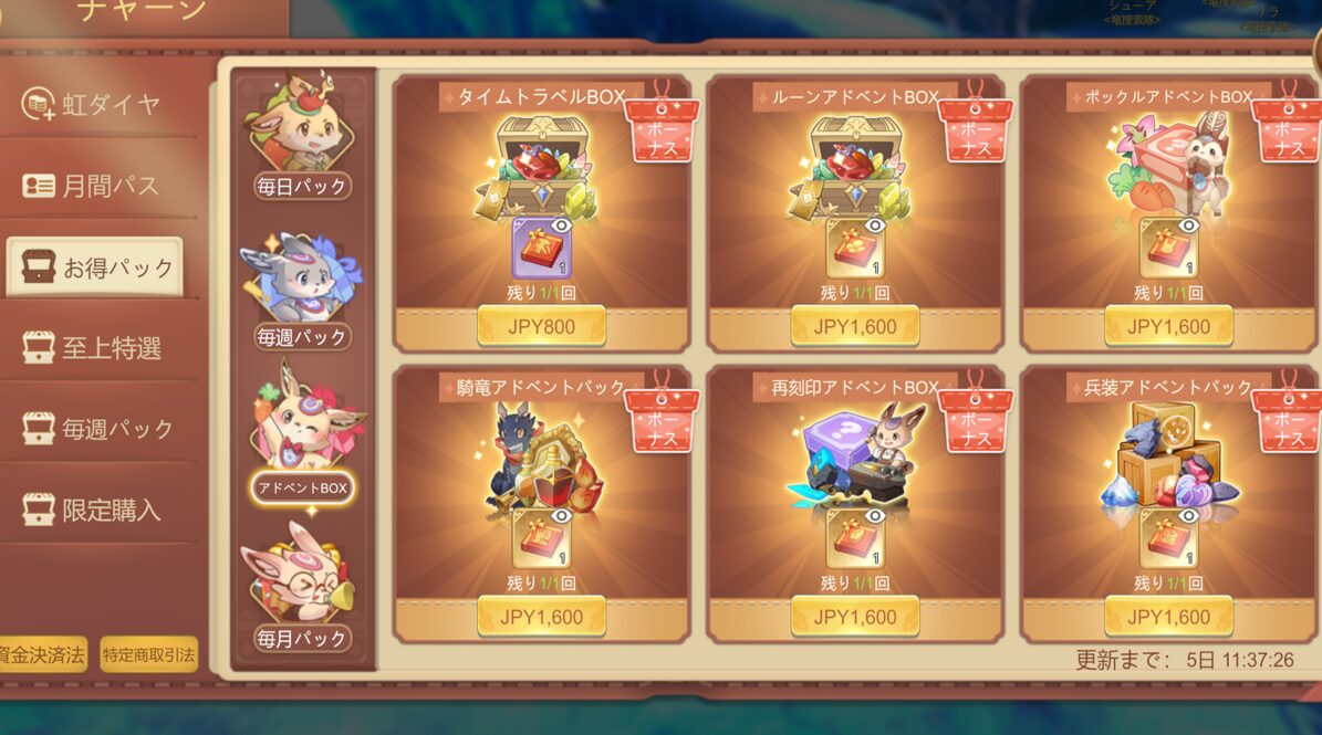 『アドベントBOX』はお得パックから購入可能。1週間にわたり、ログイン時にアイテムを獲得でき、総獲得数のコスパがよくなります。初期段階で購入しておきたいオススメのアイテム。