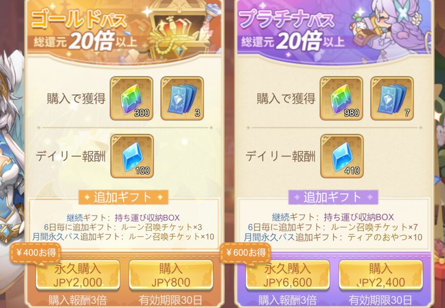 『月間パス』は、購入時にもらえる「虹ダイヤ」に加え、収納BOXにどこからでもアクセス可能になるため、快適に長くプレイしていきたい人は必須級。