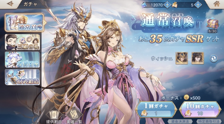 『オリエントアルカディア』のガチャの種類は、「通常召喚」「三顧の礼」「友情召喚」「幻武鍛造」の4種類で、排出されるキャラや各キャラの排出率が異なります。