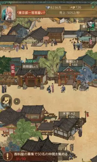 商人や店員を増やしたり、育成したりして店舗を拡大し、資産を増やしていきます。