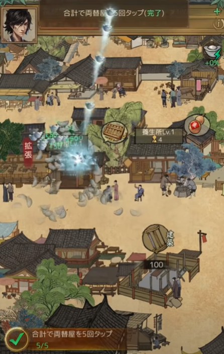 『商人放浪記』の基本操作はタップのみです。店舗を連打して資金を集める気持ちよさもあります。