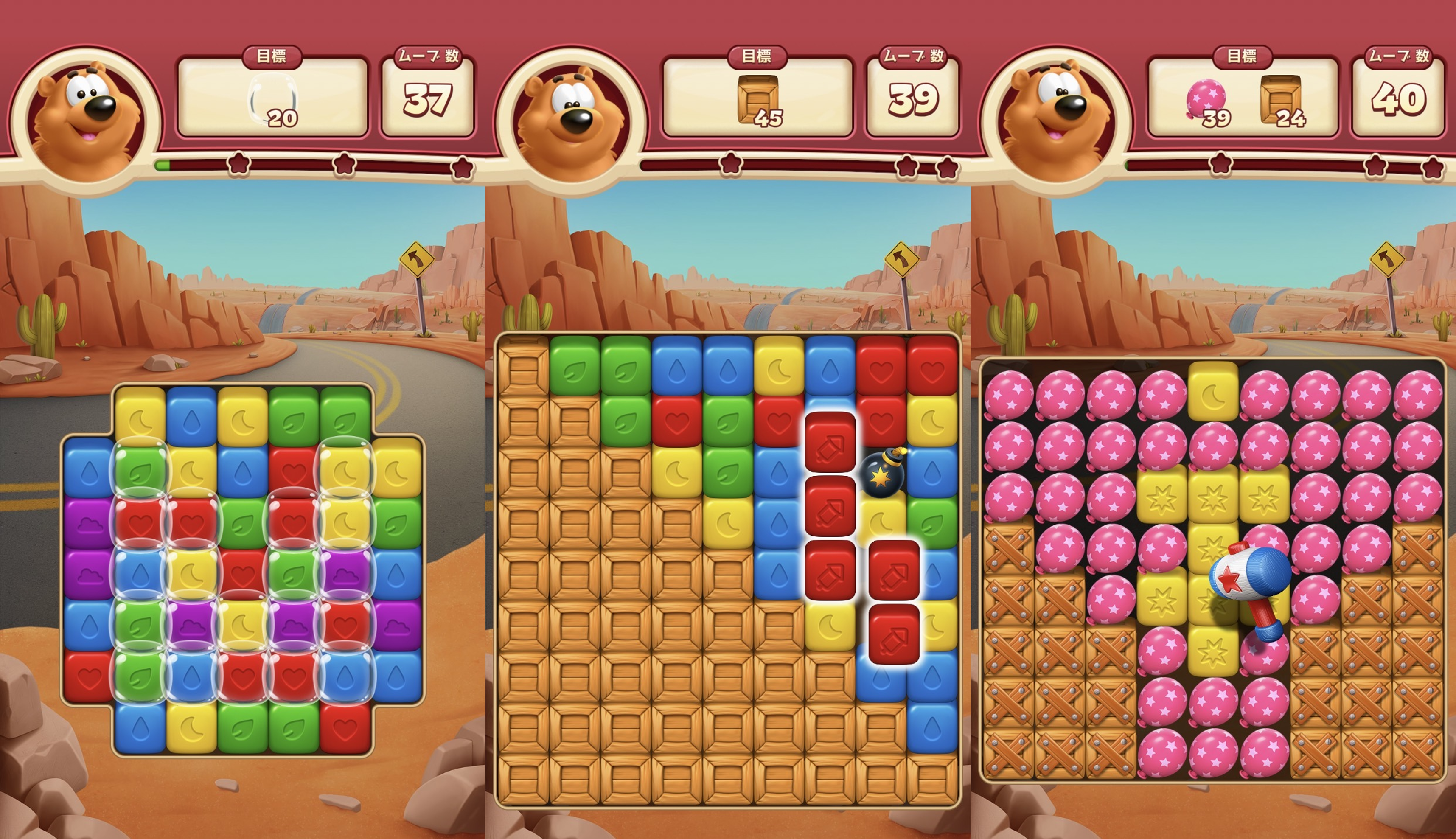 残りの消去可能回数の中で、指定のギミックを消し切ることができればクリアとなります。