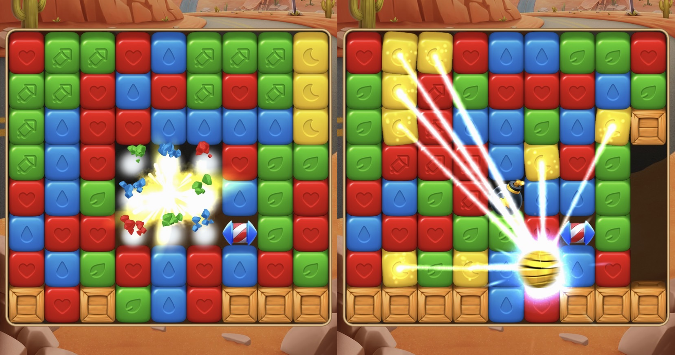 『トゥーンブラスト』は、同色のブロックのまとまり(2個以上)をタップするとその的まり全体を消去できるマッチ2パズルです。