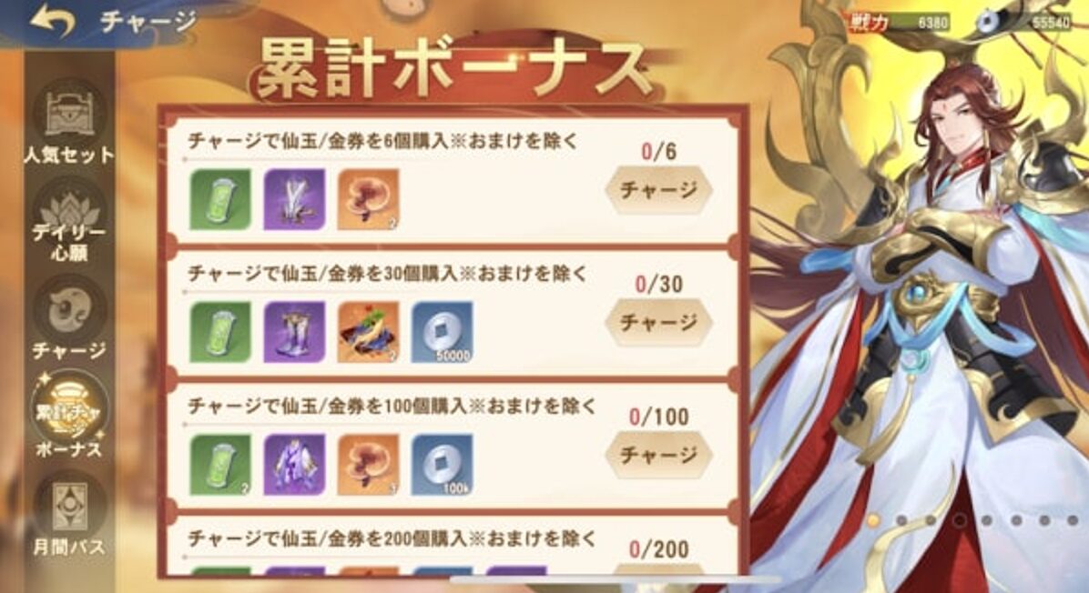 ゲーム内通貨である「仙玉」のパック購入を行っていくと、チャージ報酬が手に入ります。これを活用することで、より効率的にアイテムを入手することができます。
